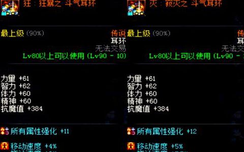 我们可以看到斗和战的属性对比,单从装备图标我们可以看到战的耳环比斗多了一颗星星,基础属性是没有变化的,而装备属性中所有属强提高了2点,移速提高了1%,施放提高了1.5%。